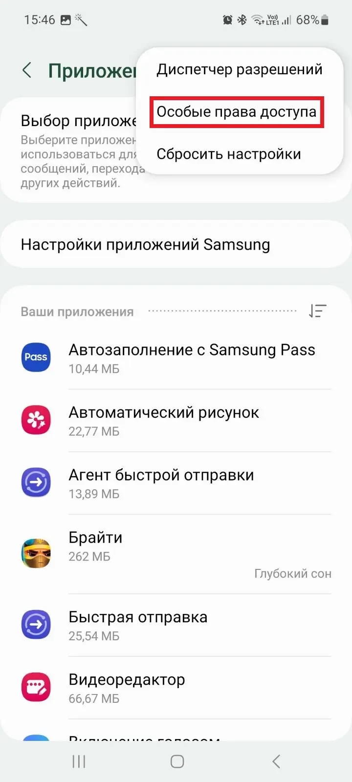 - Откройте приложение "Настройки" на устройстве ребенка > откройте раздел "Приложения" > в верхнем углу экрана нажмите на иконку меню (три вертикальные точки) > выберите пункт "Особые права доступа" > перейдите к "Оптимизация расхода батареи" > найдите в списке Parental Control Kroha и отключите переключатель (не оптимизировать);