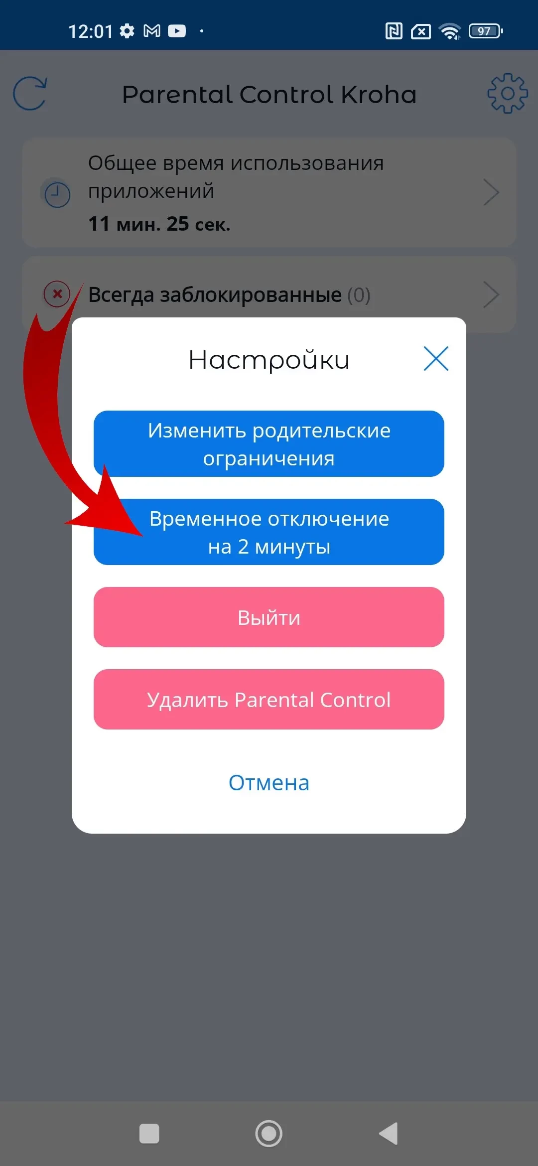 Затем откройте приложение Parental Control Kroha на устройстве ребенка > Нажмите иконку шестеренки > нажмите кнопку "Выключить на 2 минуты" > введите ПИН код. Это необходимо, чтобы настройки на устройстве ребенка не блокировались 2 минуты и вы могли проверить их.