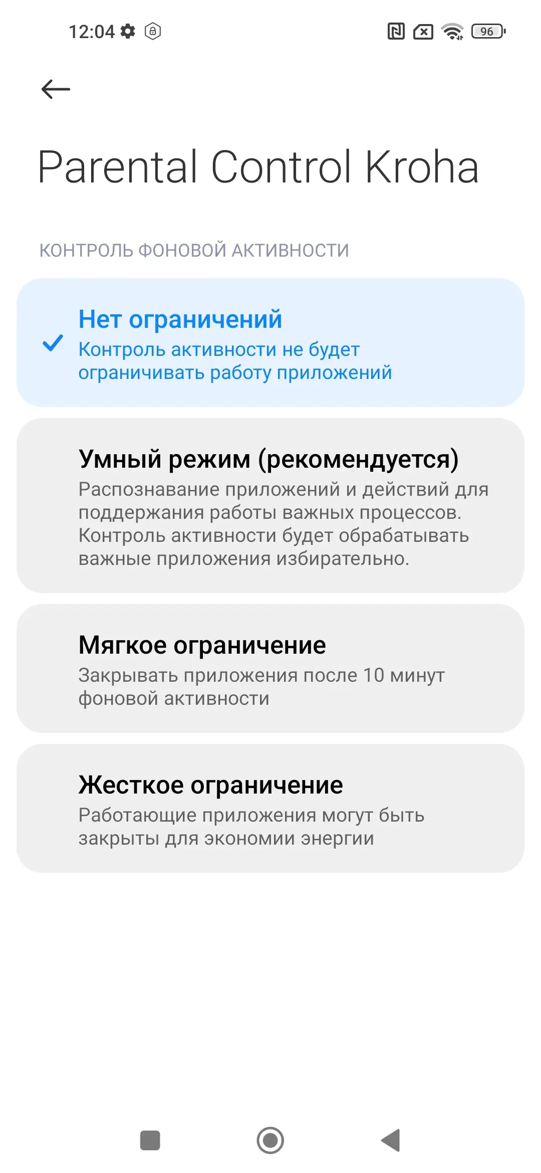 - Настройки энергосбережения: откройте приложение "Настройки" на устройстве ребёнка > откройте раздел "Приложения" > “Все приложения” > найдите приложение "Parental Control Kroha" > откройте пункт “Контроль активности” > в открывшемся меню выберите “Нет ограничений".