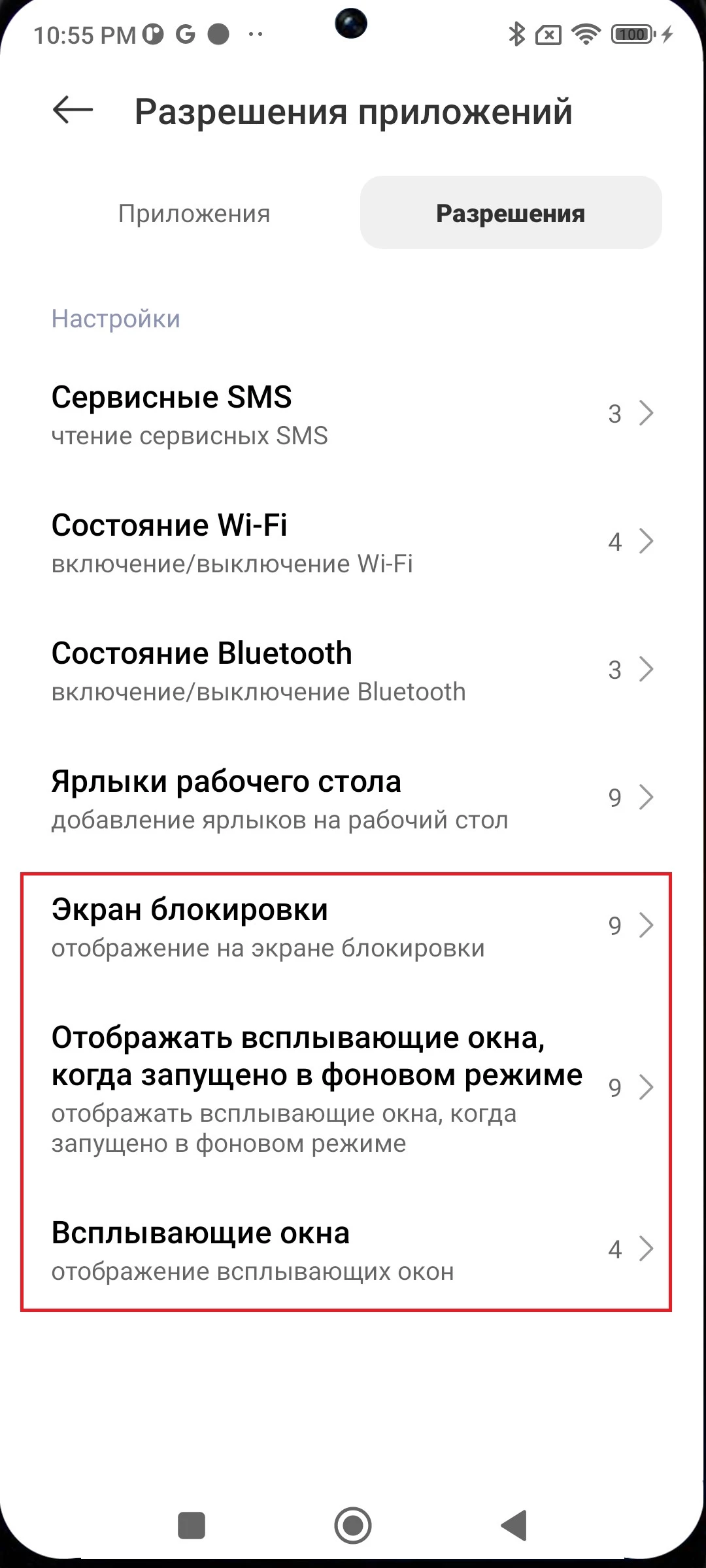 - Откройте приложение "Настройки" на устройстве ребёнка > откройте раздел "Приложения" > Разрешения > Другие разрешения > вкладка "Разрешения" > поочередно перейдите к разрешениям "Экран блокировки", "Отображать всплывающие окна, когда запущено в фоновом режиме" , "Всплывающие окна" и включите разрешения для приложения Parental Control Kroha.