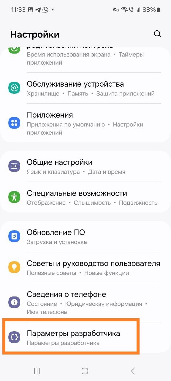 - Внизу появится раздел "Параметры разработчика", нажмите на него.