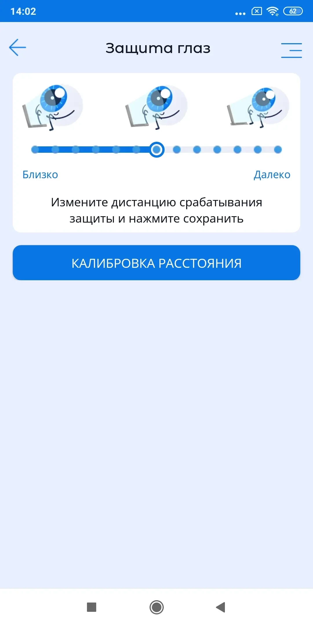 Безопасное расстояние от экрана до глаз по умолчанию устанавливается на основании рекомендаций врачей офтальмологов (30 см). Данное расстояние родители могут регулировать ползунком в нижней части экрана функции Защита глаз.