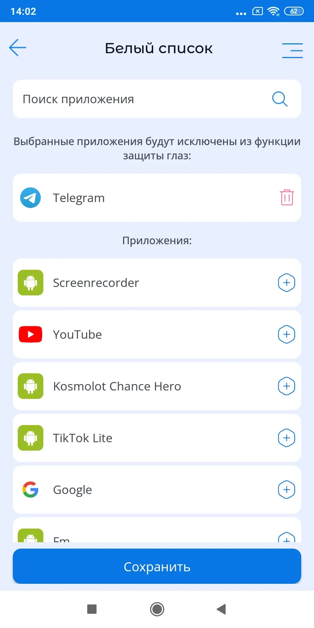Белый список – если Вы не хотите, чтобы функция Защита глаз не срабатывала для каких-то определенных приложений, их можно добавить в белый список и экран не будет блокироваться при запуске этих приложений.