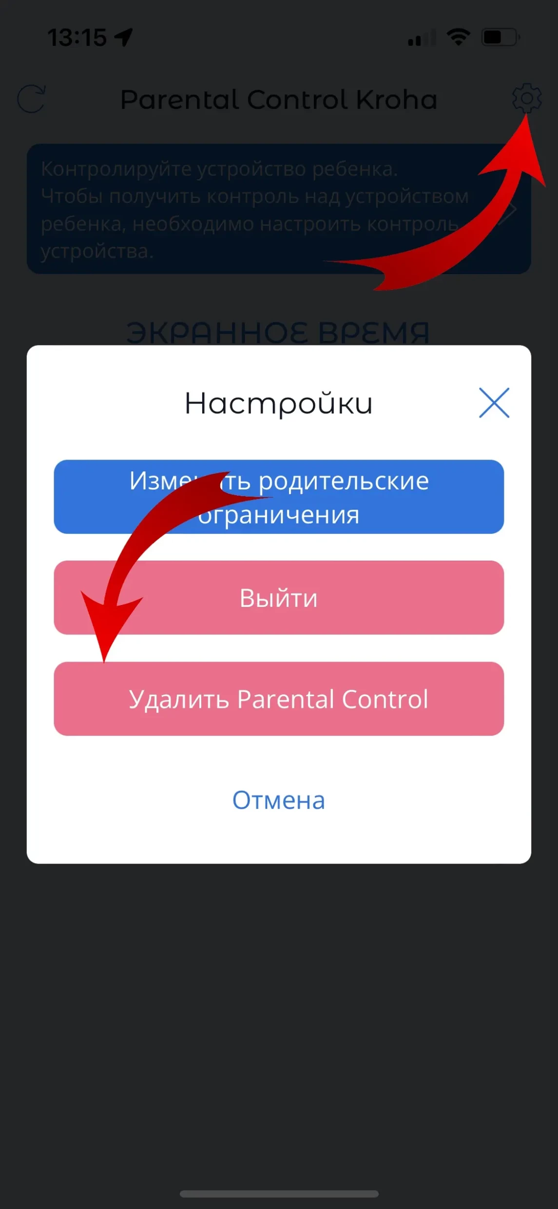 - Откройте Parental Control Kroha на устройстве ребенка -> нажмите иконку шестеренки -> нажмите "Удалить" -> подтвердить. Или Вы можете удалить приложение как обычно перетащив в корзину.