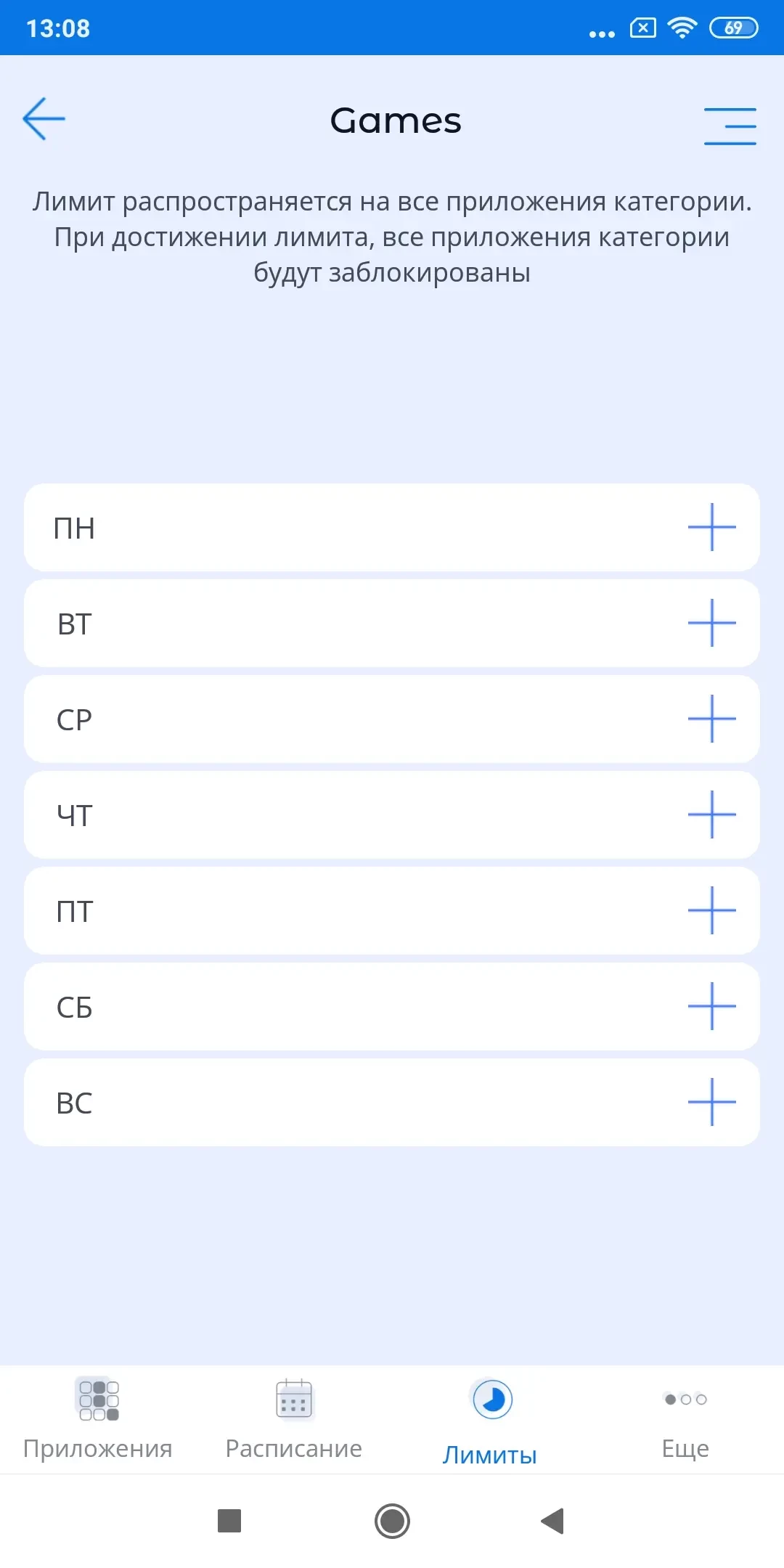 Меню "Лимиты" в разделе "Блокировка приложений" позволяет родителям настраивать ежедневный лимит для игр и приложений выбранной категории на всю неделю.