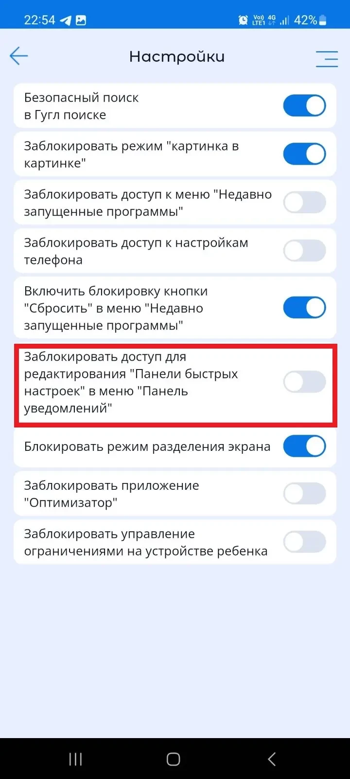 2. Убрать из активных некоторые настройки смартфона, которые могут ограничить работу приложения Parental Control Kroha. Например:
