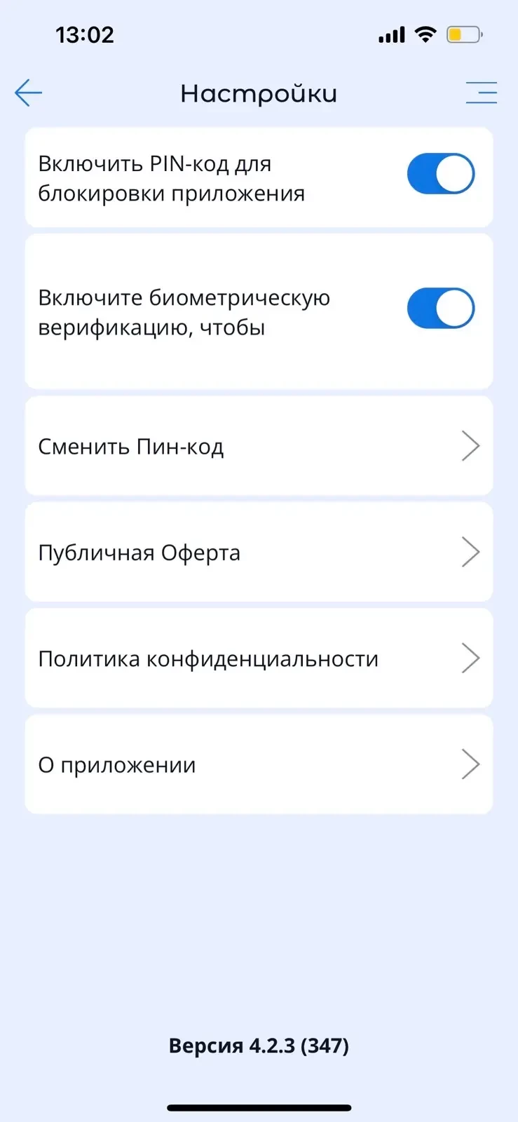 - Юридическая информация и информация о версии приложения.