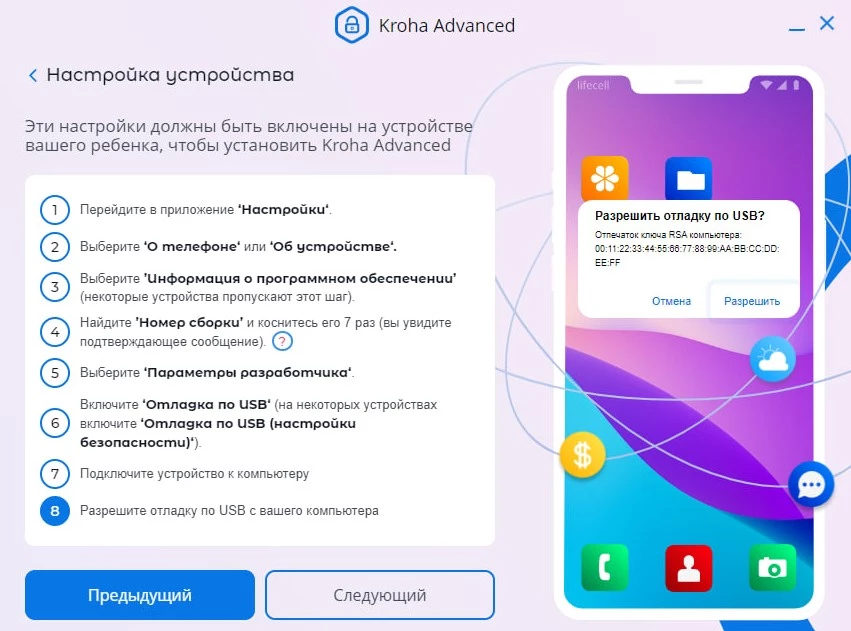 - На устройстве ребенка не появляется оповещение "Разрешить отладку по USB" и кнопка "Следующий" не активна.