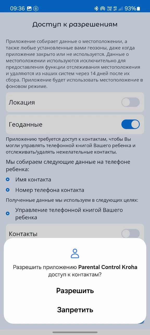 - «Доступ к контактам» - если Вы хотите видеть контакты на смартфоне ребенка и управлять ими;