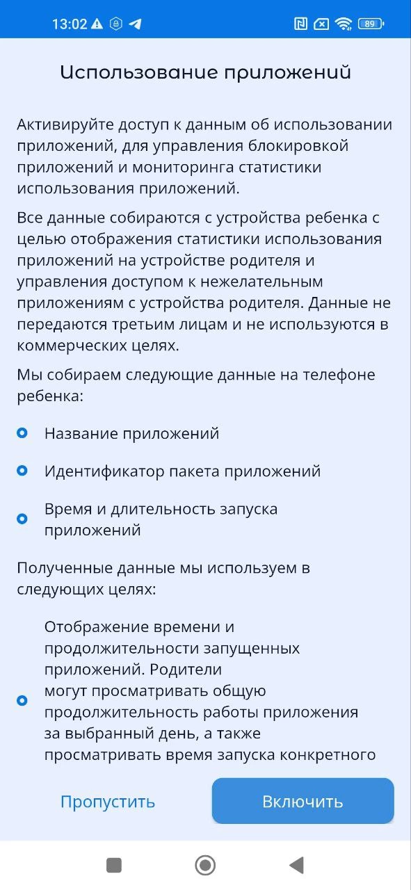 - «Использование приложений», активируйте доступ к данным об использовании приложений, для правильной работы приложения Parental Control Kroha, для этого прочитайте пошаговую инструкцию и нажмите «далее»;