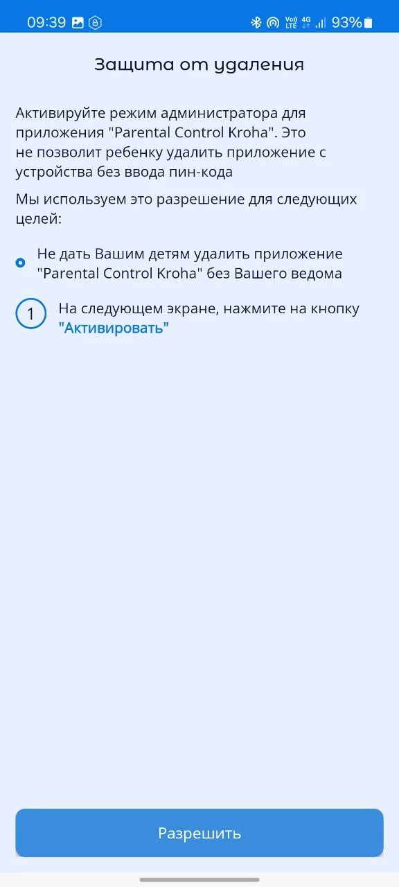 - «Защита от удаления», активируйте режим администратора для приложения Parental Control Kroha. Это не позволит ребенку удалит приложение с устройства без ввода пин-кода, для этого прочитайте пошаговую инструкцию и нажмите «далее»;