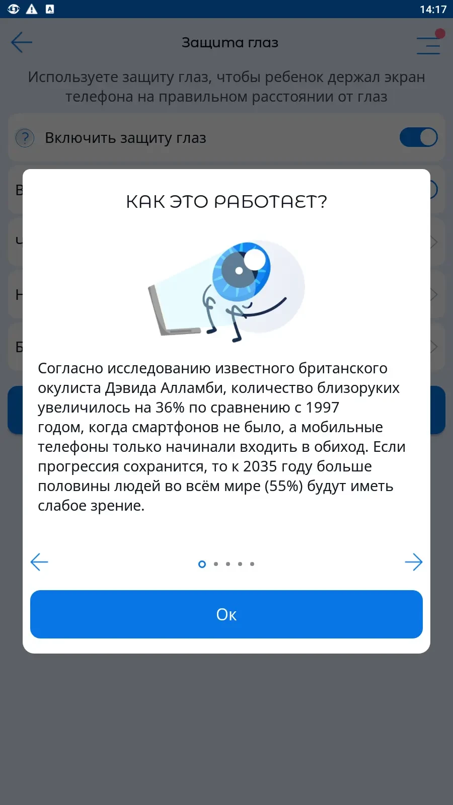 Безопасное расстояние от экрана до глаз по умолчанию устанавливается на основании рекомендаций врачей офтальмологов (30 см). Данное расстояние родители могут регулировать ползунком в нижней части экрана функции Защита глаз.