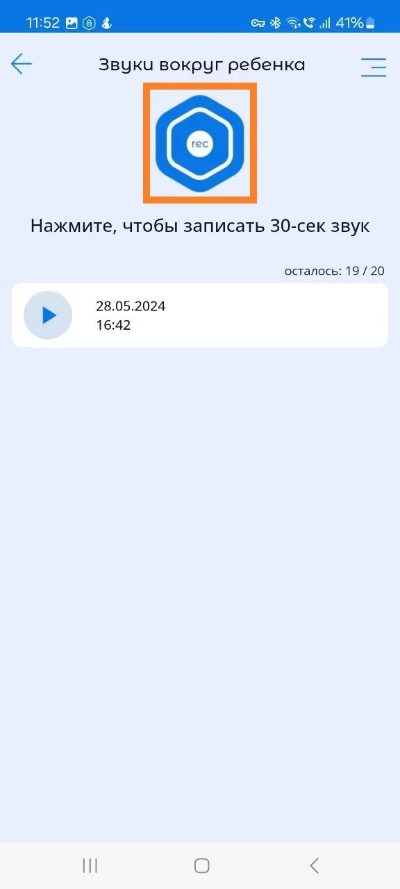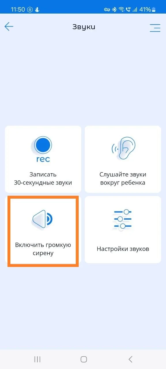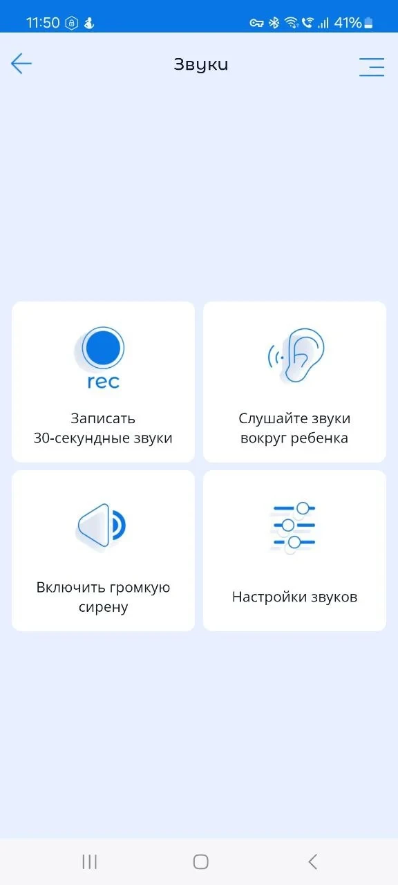 В разделе "Звуки" у родителей есть возможность: записать 30-секундные звуки, слушать звук вокруг детского устройства, включить громкую сирену, включить звук на детском устройстве.