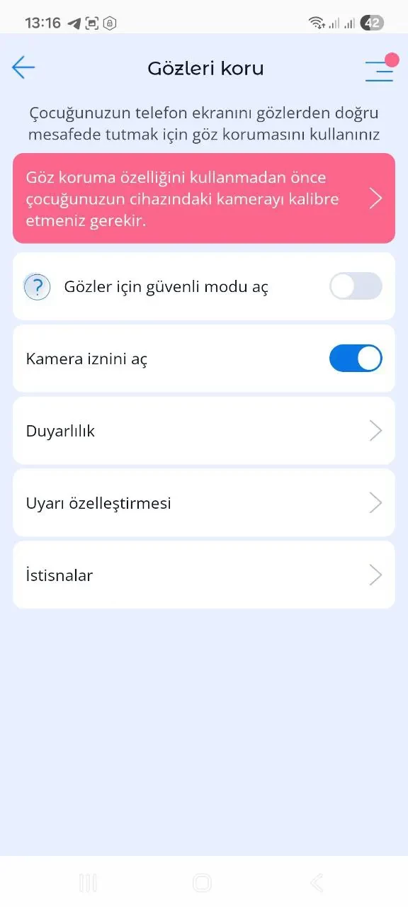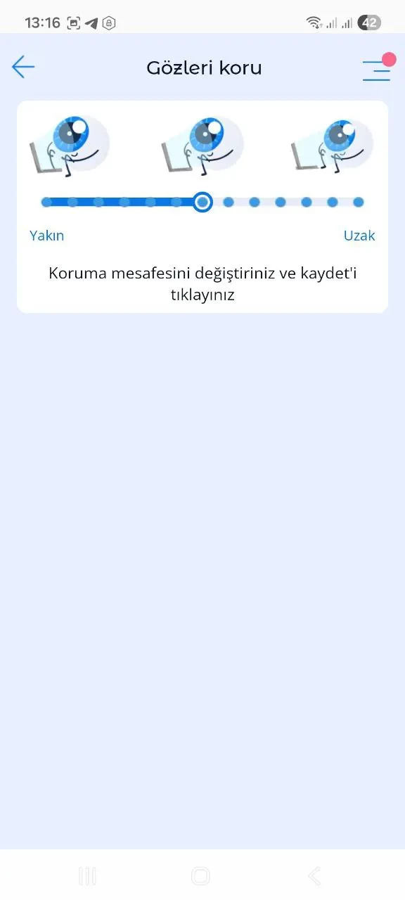 Ekran ile gözler arasındaki varsayılan güvenli mesafe, göz doktorlarının tavsiyelerine (30 cm) dayanmaktadır. Ebeveynler, göz koruma ekranının altındaki kaydırıcıyı kullanarak bu mesafeyi ayarlayabilirler.