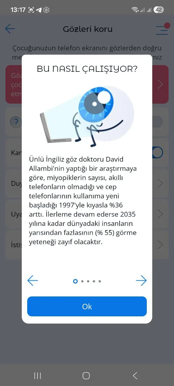 Bu işlevin temel amacı, ekranın çocuğun gözlerine çok yakın olduğunda, gözün maruz kaldığı etkinin miyopi gelişimine yol açma riskini azaltmaktır.