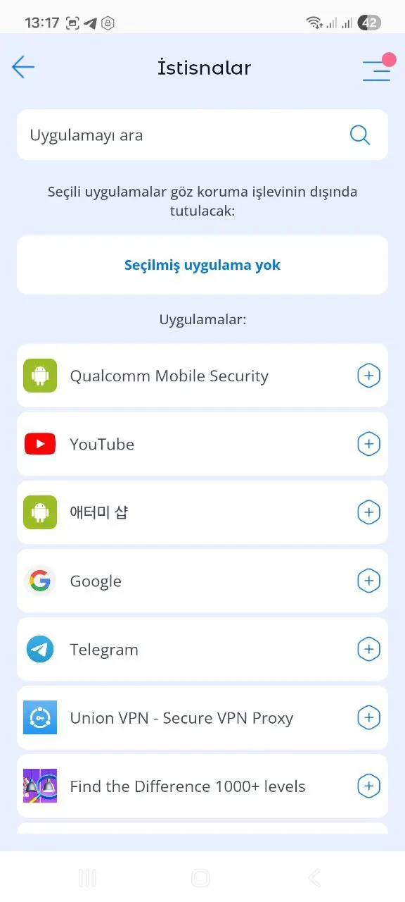 Beyaz Liste: Göz korumanın belirli uygulamaları engellemesini istemiyorsanız, bu uygulamaları beyaz listeye ekleyebilirsiniz; bu durumda bu uygulamalar açıldığında ekran kilitlenmez.