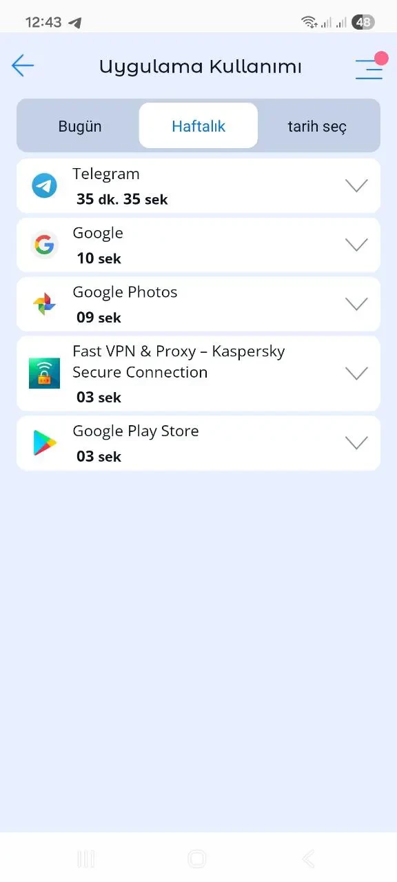 - Haftalık toplam uygulama kullanım süresi.
