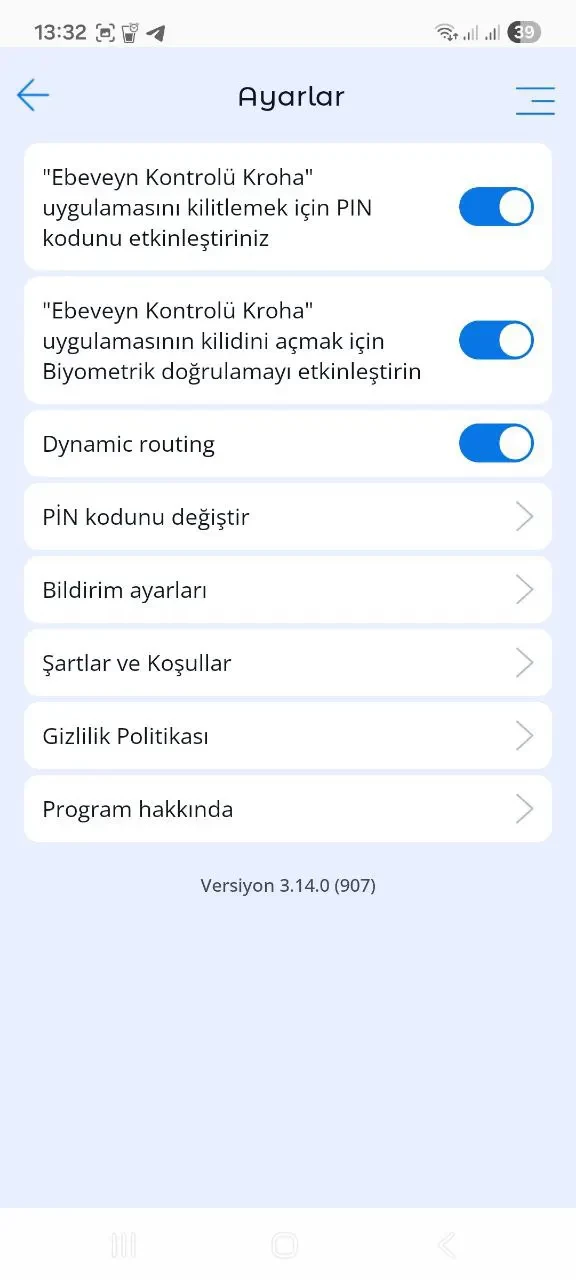 7. Ayarlar. Bu menü, ebeveynlerin, çocuğunun akıllı telefonunda uygulamanın çalışmasını engelleyen belirli seçenekleri yasaklamasına yardımcı olacak özellikleri sunar. Ayrıca, uygulamanın performansının kısıtlanmaması için 'Kroha ebeveyn kontrolü' ve 'güç tasarrufu modu' ile batarya optimizasyonu düzgün yapılandırılmalıdır.