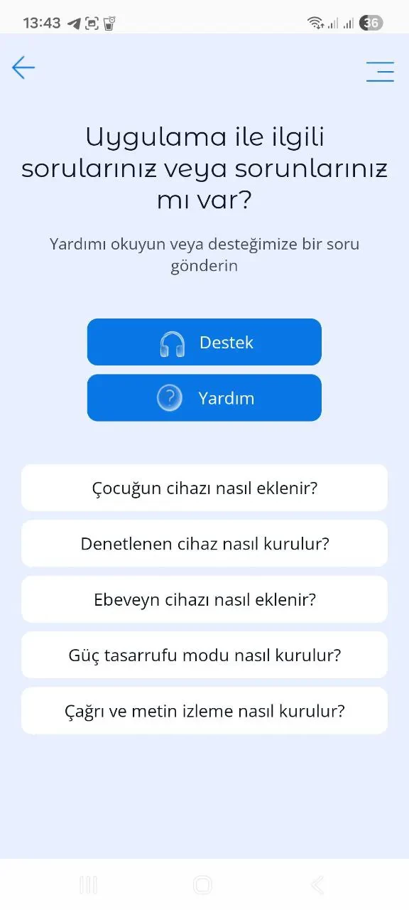 5. Destek. Bu menüde, uygulamanın kullanımıyla ilgili sorunlarda hızlı yardım alabilirsiniz. Yanıt, kayıt sırasında belirttiğiniz e-posta adresine gönderilecektir.