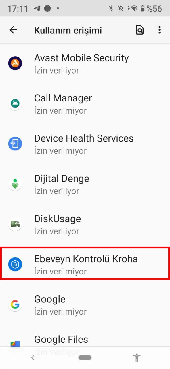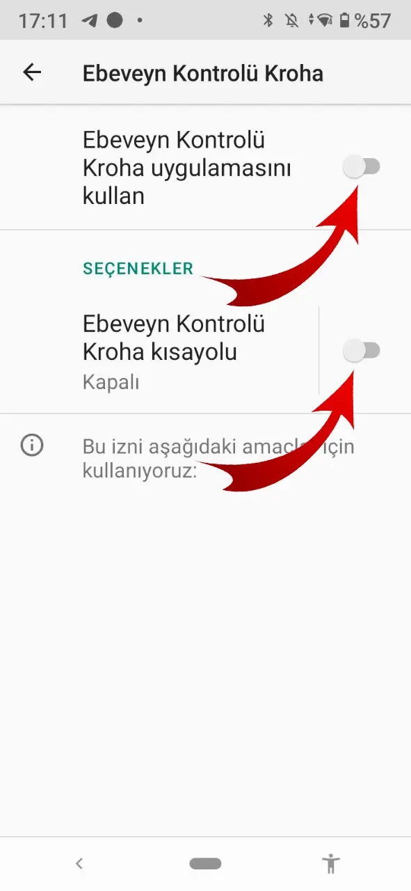“Uygulama Kullanımı”: ebeveyn denetimi uygulaması olan Kroha'nın düzgün çalışabilmesi için, uygulama kullanım verilerine erişimi etkinleştirin; detaylar için adım adım kılavuzu okuyun ve ‘Etkinleştir’ seçeneğine dokunun;