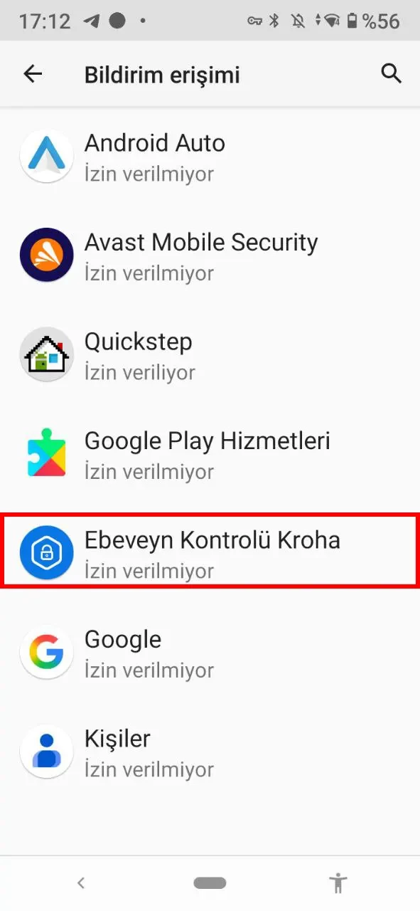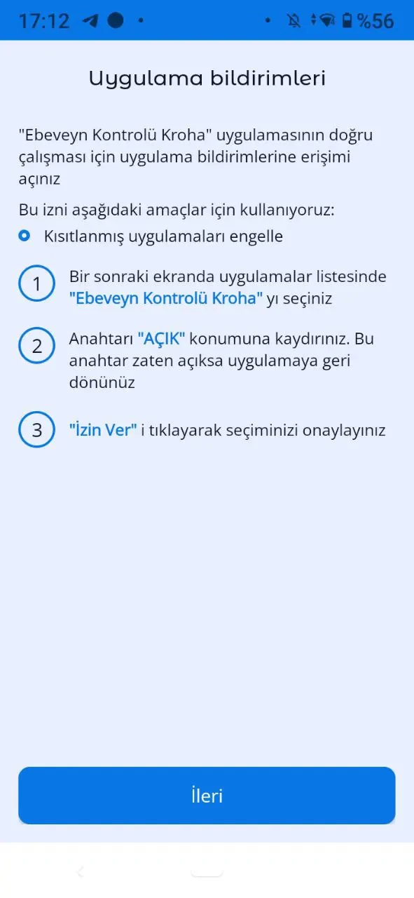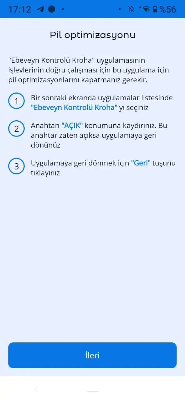 “Pil Optimizasyonu”: uygulamanın düzgün çalışabilmesi için, ebeveyn denetimi uygulaması olan Kroha için pil optimizasyonunu devre dışı bırakmanız gerekmektedir; detaylar için adım adım kılavuzu okuyun ve ‘İleri’ seçeneğine dokunun;