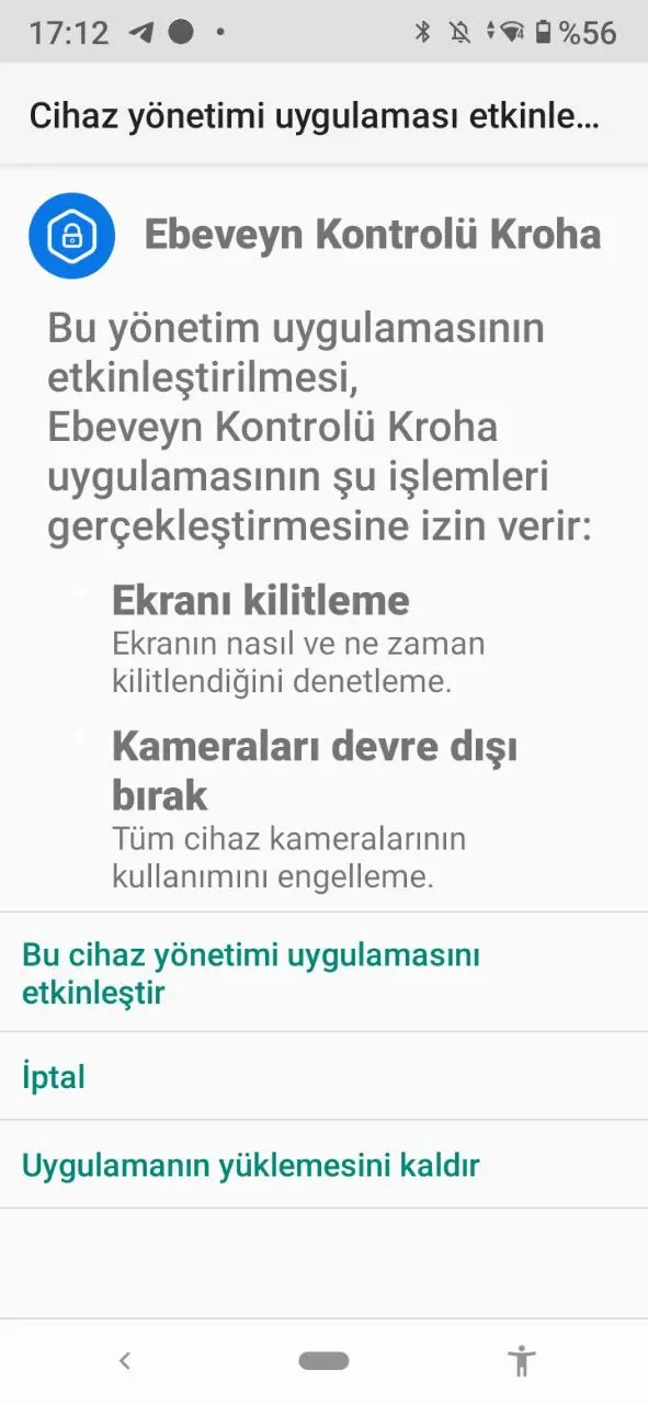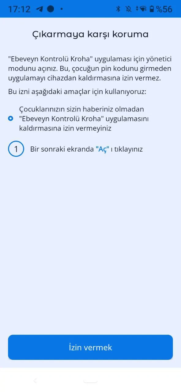 “Kaldırma Koruması”: ebeveyn denetimi uygulaması olan Kroha için yönetici modunu etkinleştirin. Bu, çocuğunuzun PIN kodunu girmeden uygulamayı cihazdan silmesini engelleyecektir; detaylar için adım adım kılavuzu okuyun ve ‘İzin Ver’ seçeneğine dokunun;