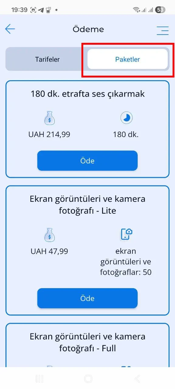 Hesabınızı ek cihazlarla genişletebilir, "çocukların etrafındaki sesler" özelliği için ek dakika paketleri satın alabilir veya "Ekran görüntüleri" özelliği için ek paketler satın alabilirsiniz. Ek hizmetler için ödemeyi, Kroha ebeveyn kontrolü uygulamasındaki "Ödeme" bölümünde ("Paketler" sekmesi) gerçekleştirebilirsiniz.