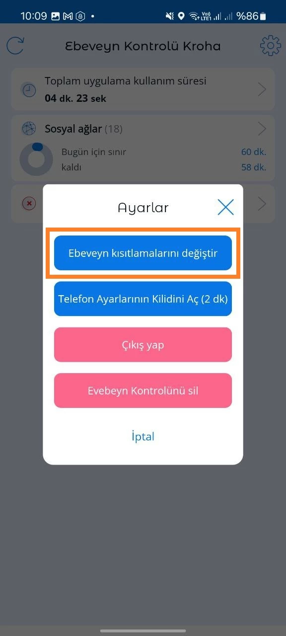 Öncelikle, çocuğunuzun cihazında Kroha ebeveyn kontrolü uygulamasını açın > Ayar simgesine dokunun > “Ebeveyn Kısıtlamalarını Düzenle” seçeneğine dokunun > PIN kodunu girin > Herhangi bir kurulum rehberi çıkarsa, adımları izleyin.