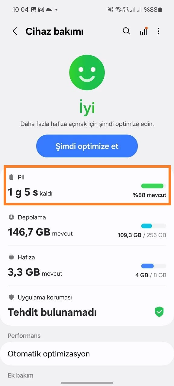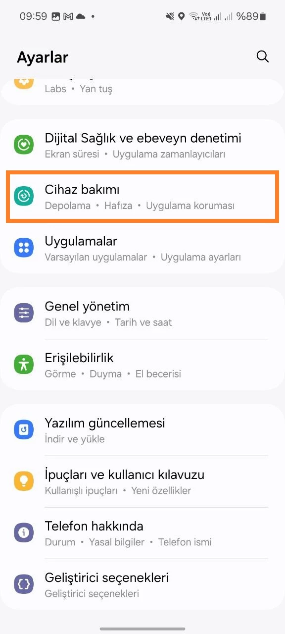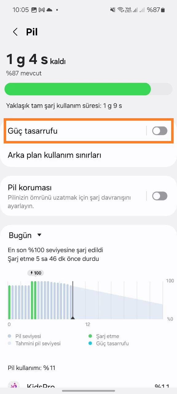 - Çocuğunuzun cihazında Ayarlar'ı açın > Cihaz Bakımı > Pil > Güç Tasarrufu > Kapat.
