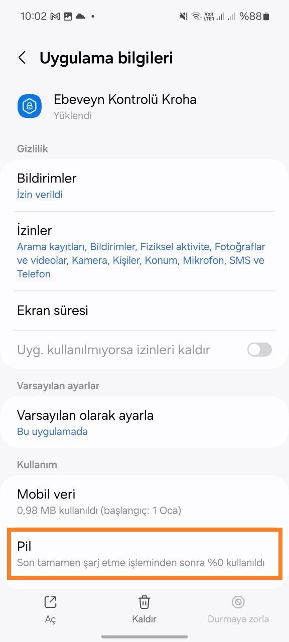 - Çocuğunuzun cihazında Ayarlar'ı açın > Uygulamalar > Kroha ebeveyn kontrolü uygulaması > Pil > Optimize Etme.