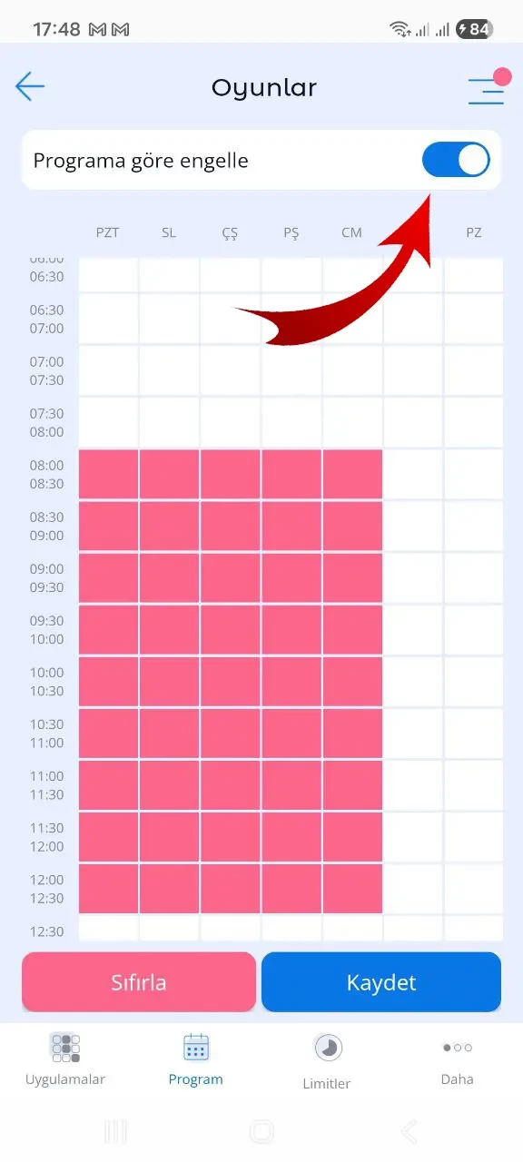 Uygulama Kilidi özelliğinde bir program ayarlamak için, ebeveynler çocuğun oyun oynaması, video izlemesi veya sosyal medyada iletişim kurmasıyla dikkatinin dağılmaması gereken bir zaman dilimi için uygulama kilitlerini ayarlar (örneğin okulda). İstediğiniz zaman dilimini, sürenin başlangıcındaki hücreyi sabitleyip kilitleme süresinin sonuna doğru hücre seçimini sürükleyerek kilitleyin. Zamanlanmış Kilit anahtarını etkinleştirin. Seçilen hücrelere denk gelen zaman, seçilen kategoriye ait uygulamalar için kilitlenecektir.