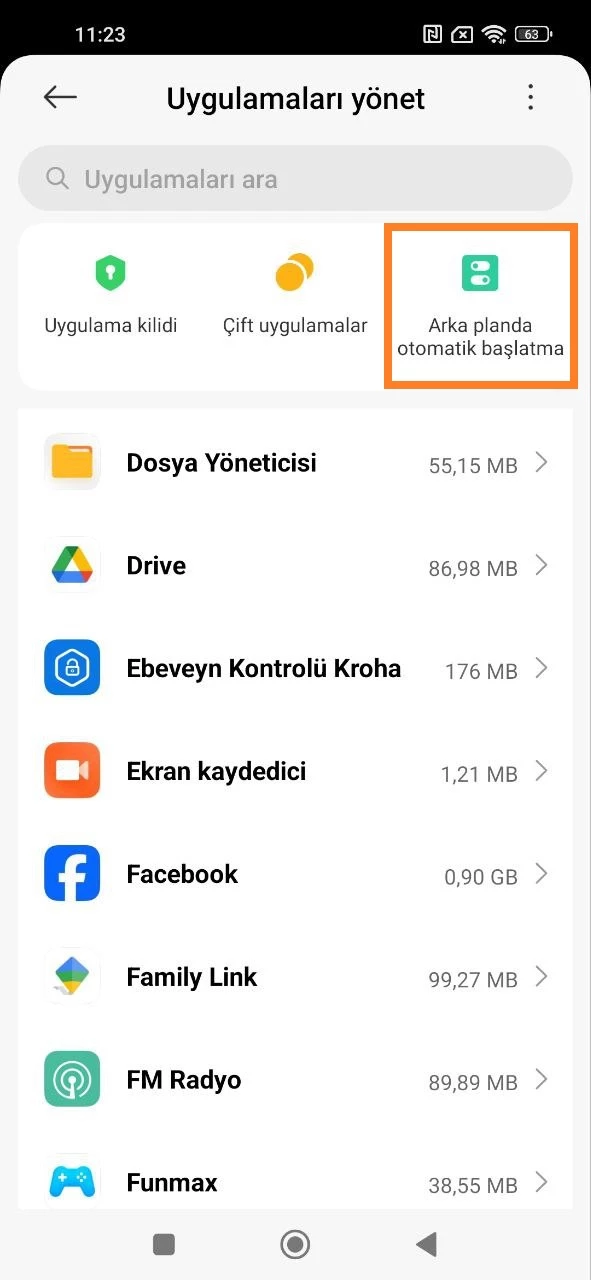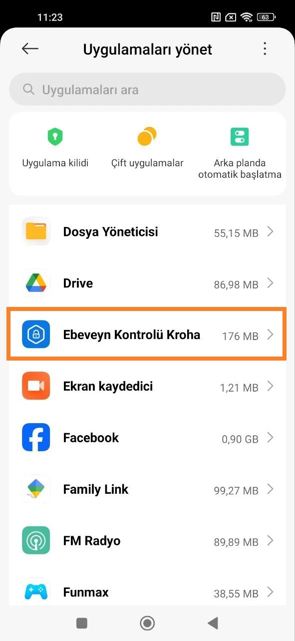 - Otomatik başlangıç ayarları: Çocuğunuzun cihazında Ayarlar uygulamasını açın > Uygulamalar bölümünü açın > Uygulamaları Yönet > Arka plan otomatik başlatmayı açın > Parental Control Kroha ebeveyn kontrolü uygulaması'nı bulun > Anahtarı açın.