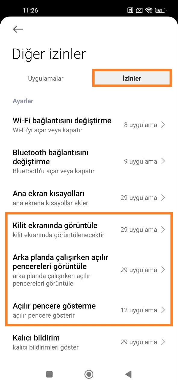 - Çocuğunuzun cihazında Ayarlar uygulamasını açın > Uygulamalar bölümünü açın > İzinler > Diğer izinler > İzinler sekmesini açın > Kilit ekranı, Arka planda çalışırken açılır pencereleri göster, Açılır pencere izinlerini tek tek gidin ve Parental Control Kroha ebeveyn kontrolü uygulaması için izinleri etkinleştirin.