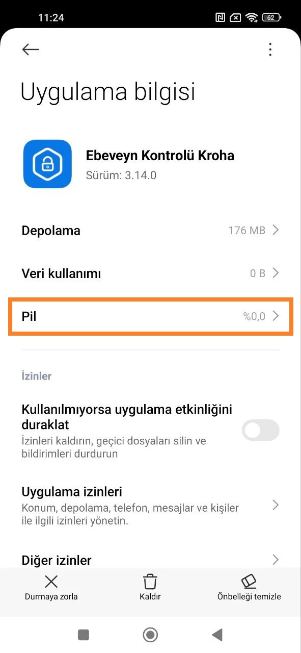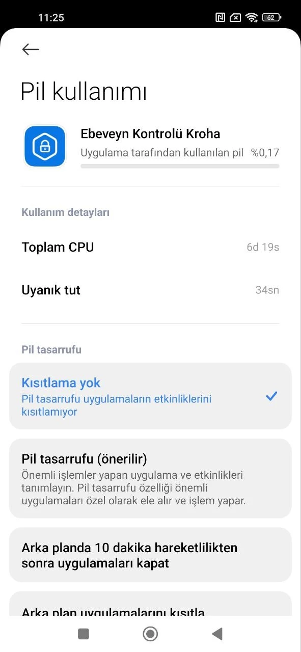 - Güç tasarrufu ayarları: Çocuğunuzun cihazında Ayarlar uygulamasını açın > Uygulamalar bölümünü açın > Uygulamaları Yönet > Parental Control Kroha ebeveyn kontrolü uygulaması'nı bulun > Batarya tasarrufu > "Kısıtlamayı kaldır"ı seçin.