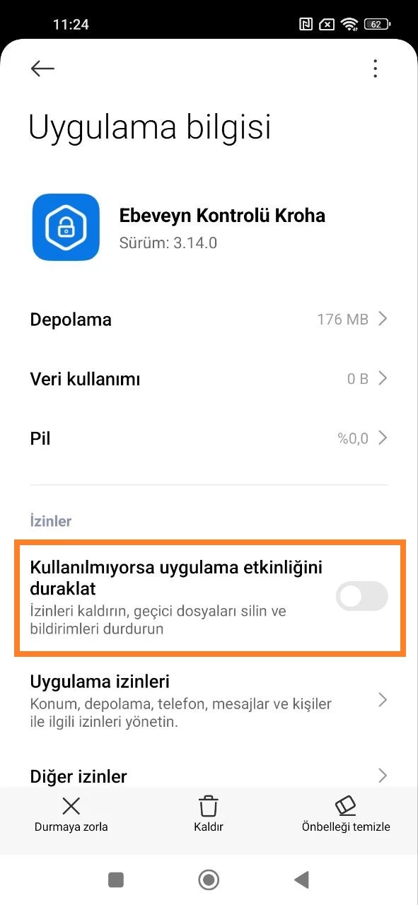 - Çocuğunuzun cihazında Ayarlar uygulamasını açın > Uygulamalar bölümünü açın > Uygulamaları Yönet > Parental Control Kroha ebeveyn kontrolü uygulaması'nı bulun > “Kullanılmadığında uygulamayı duraklat” yanındaki anahtarı kapatın.