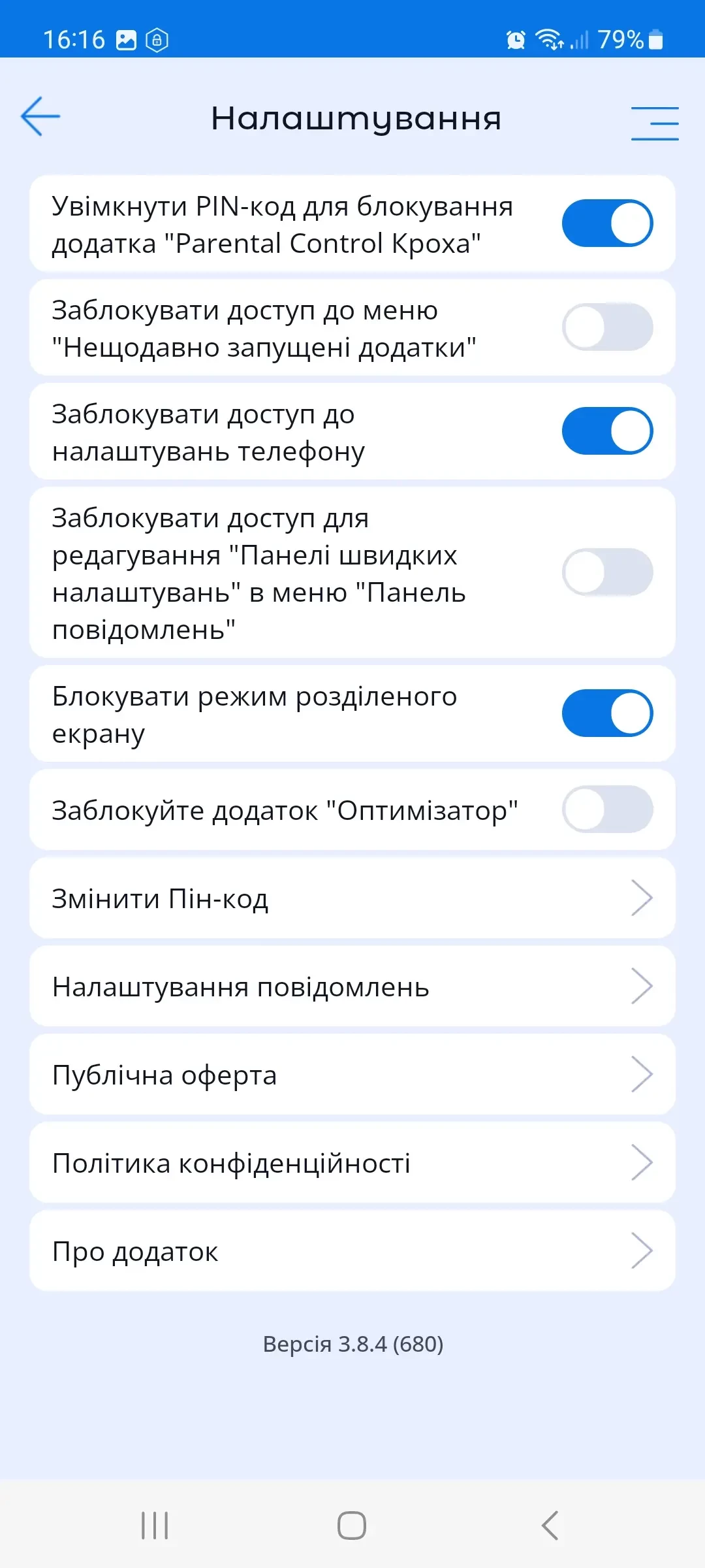 7. Налаштування. У цьому меню виведено функції, які допоможуть батькам заборонити на смартфоні дитини деякі опції, що обмежують роботу програми.