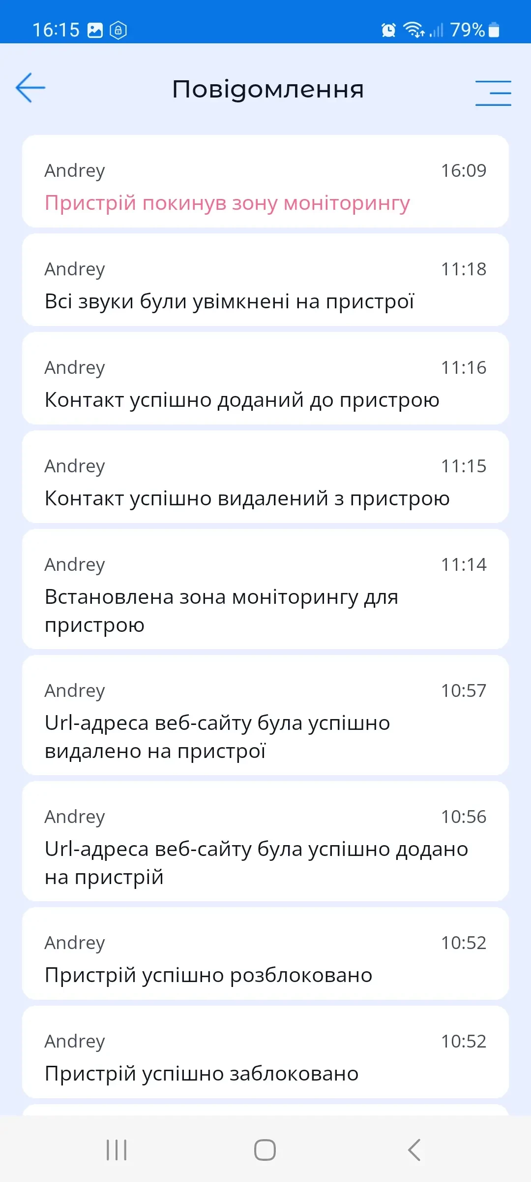 2. Повідомлення. Тут знаходяться важливі повідомлення про події на телефоні дитини (вихід за межі геозони, встановлення нових програм, відключення критично важливих для роботи програми дозволів).