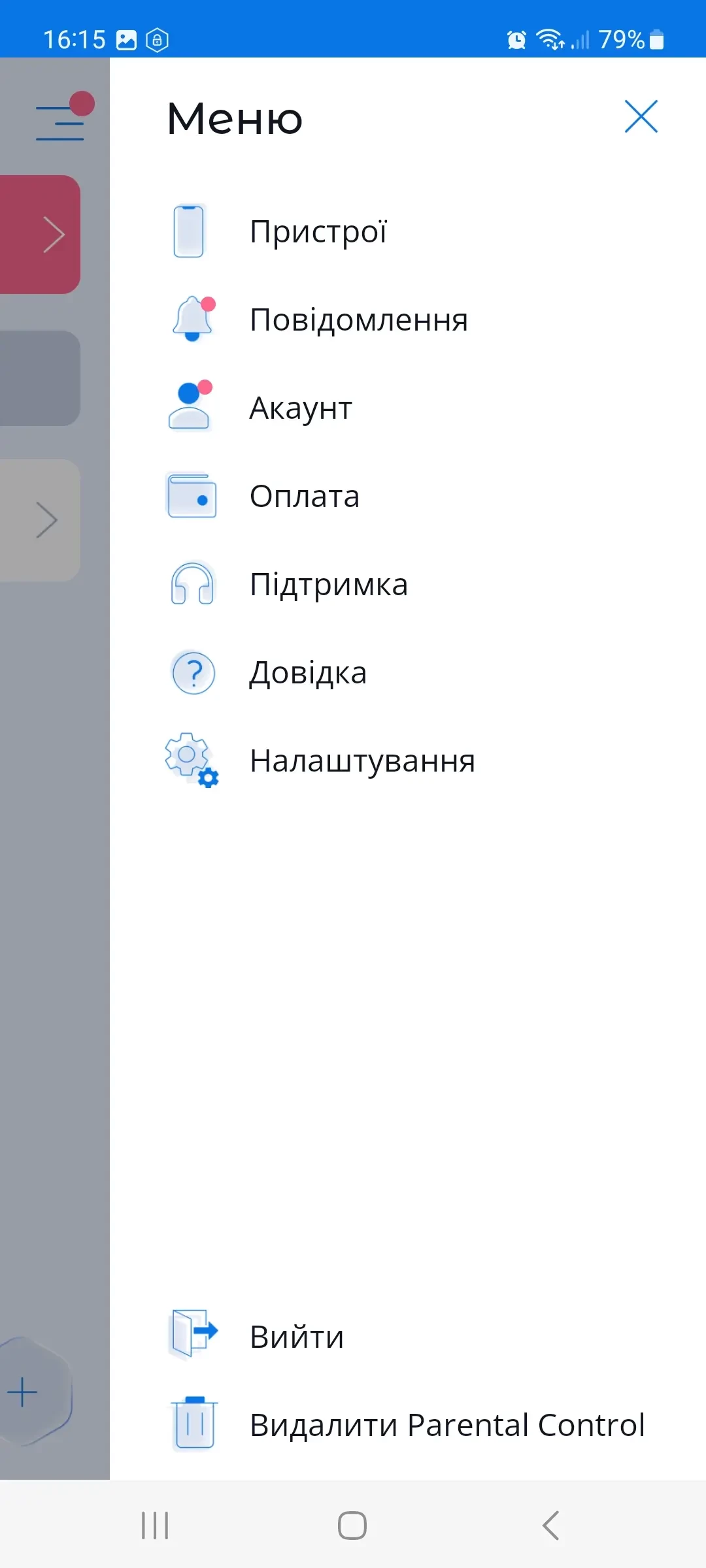 Кнопка "Налаштування" в основному меню – можливість міняти налаштування з батьківського пристрою на вибраному дитячому пристрої.