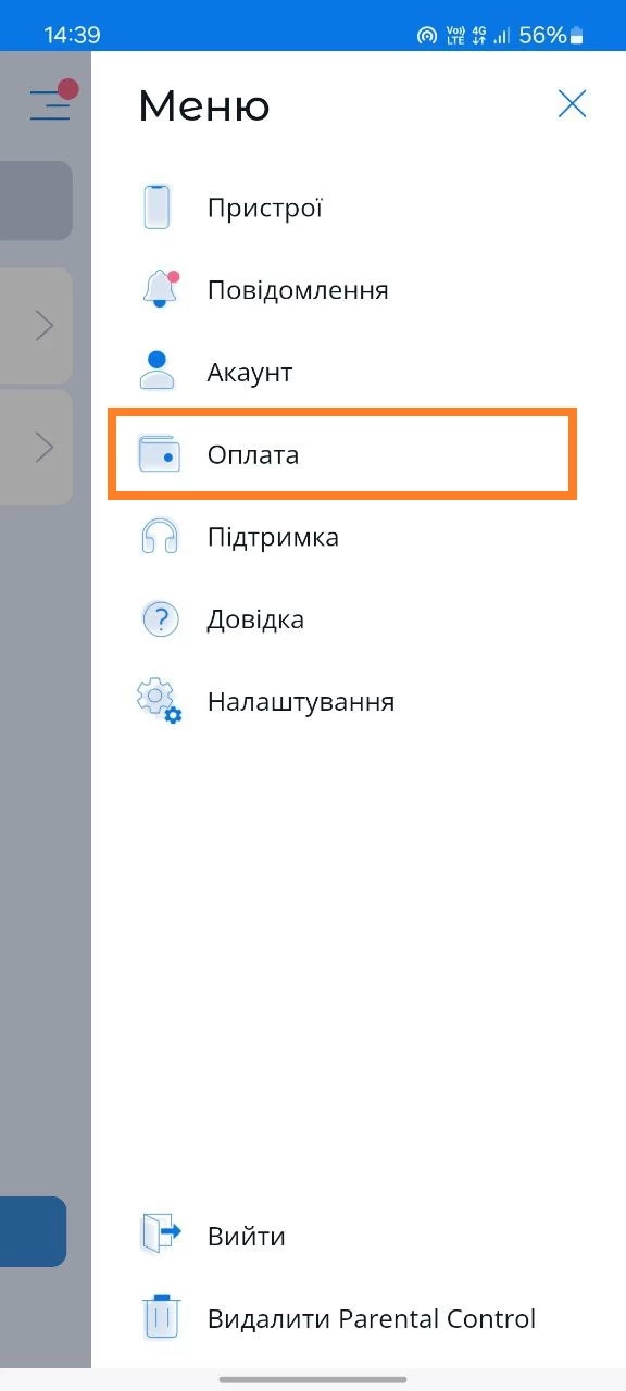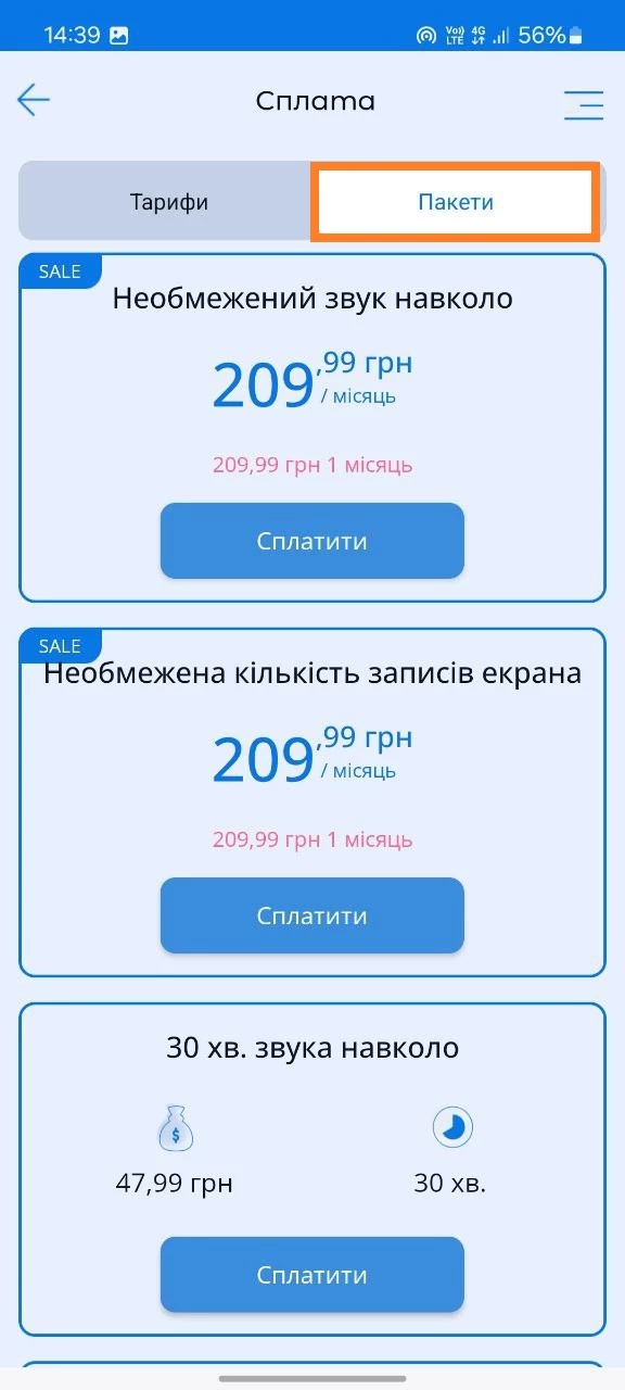 Сплатити за додаткові послуги можна в застосунку Parental Control Kroha у розділі "Оплата", вкладка "Пакети".