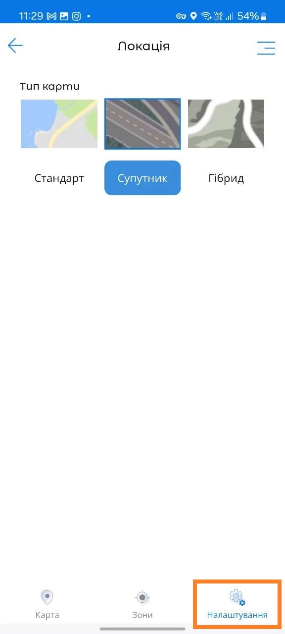 Тут користувачі можуть змінити тип відображення карти. Доступні такі режими "Стандарт", "Супутник", "Гібрид".