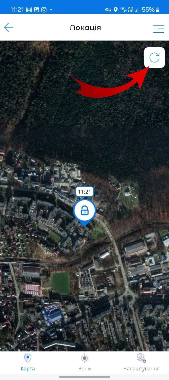 Тут з'являється поточна локація дитячого пристрою. Над точкою пристрою Ви побачите дату та час, коли була отримана остання координата з телефону дитини, якщо координату було отримано давно і вже не актуально, натисніть "Оновити" у правому верхньому куті.
