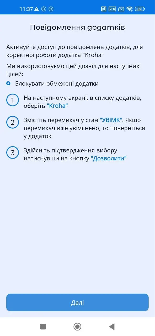 "Повідомлення додатків", активуйте доступ до повідомлень додатків, для цього прочитайте покрокову інструкцію та натисніть "Далі";