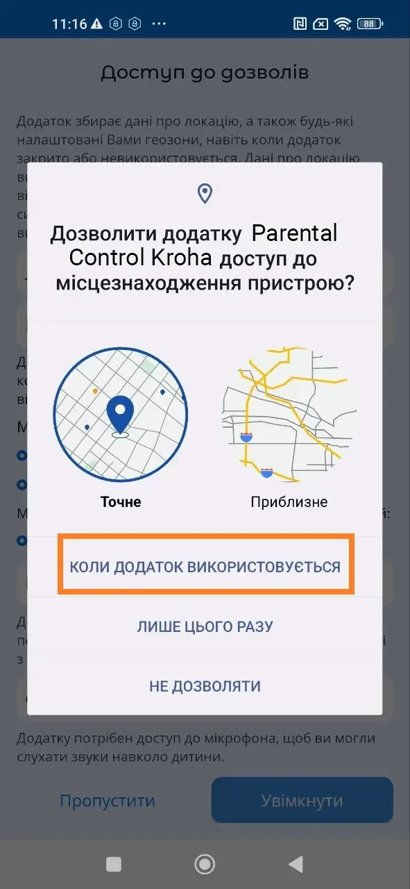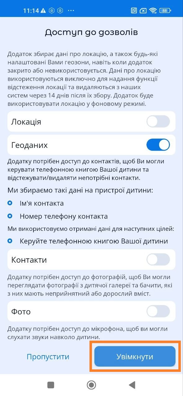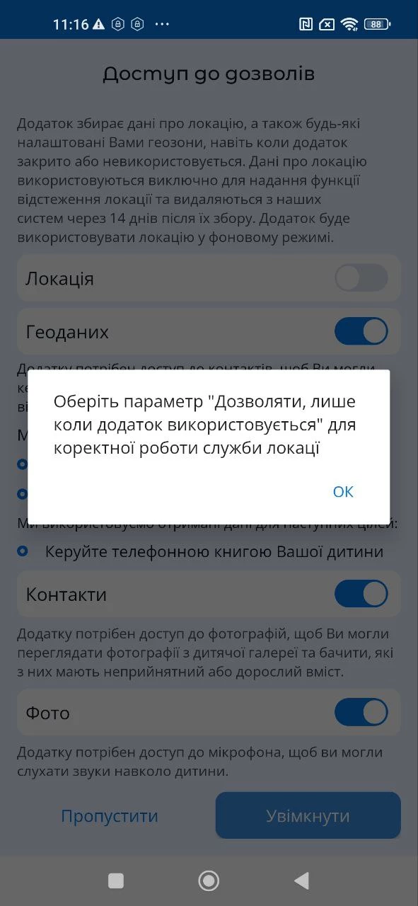 Для коректної роботи застосунку необхідно налаштувати дозволи при підключенні пристрою дитини до Вашого облікового запису.