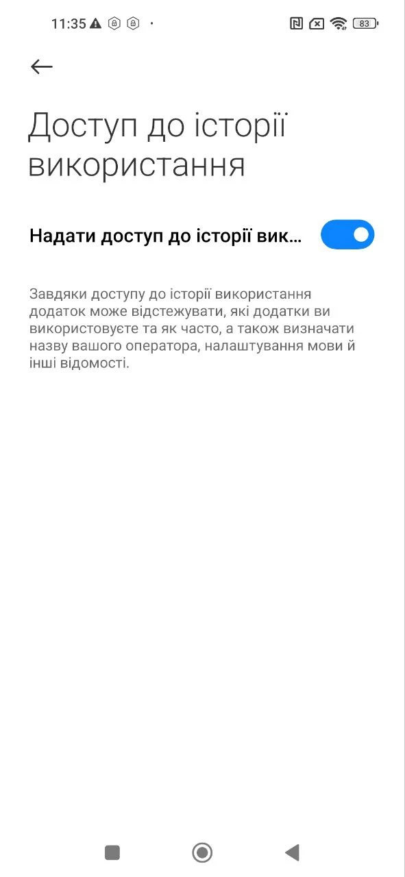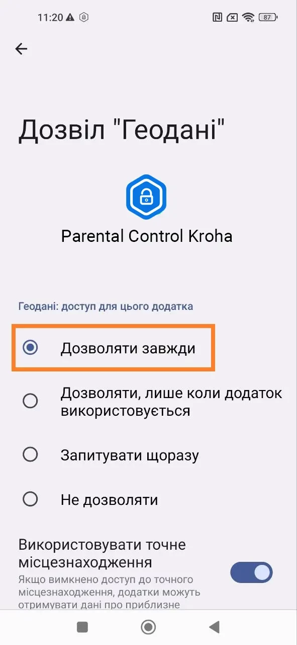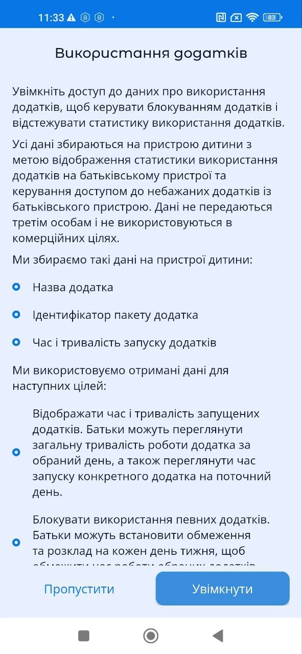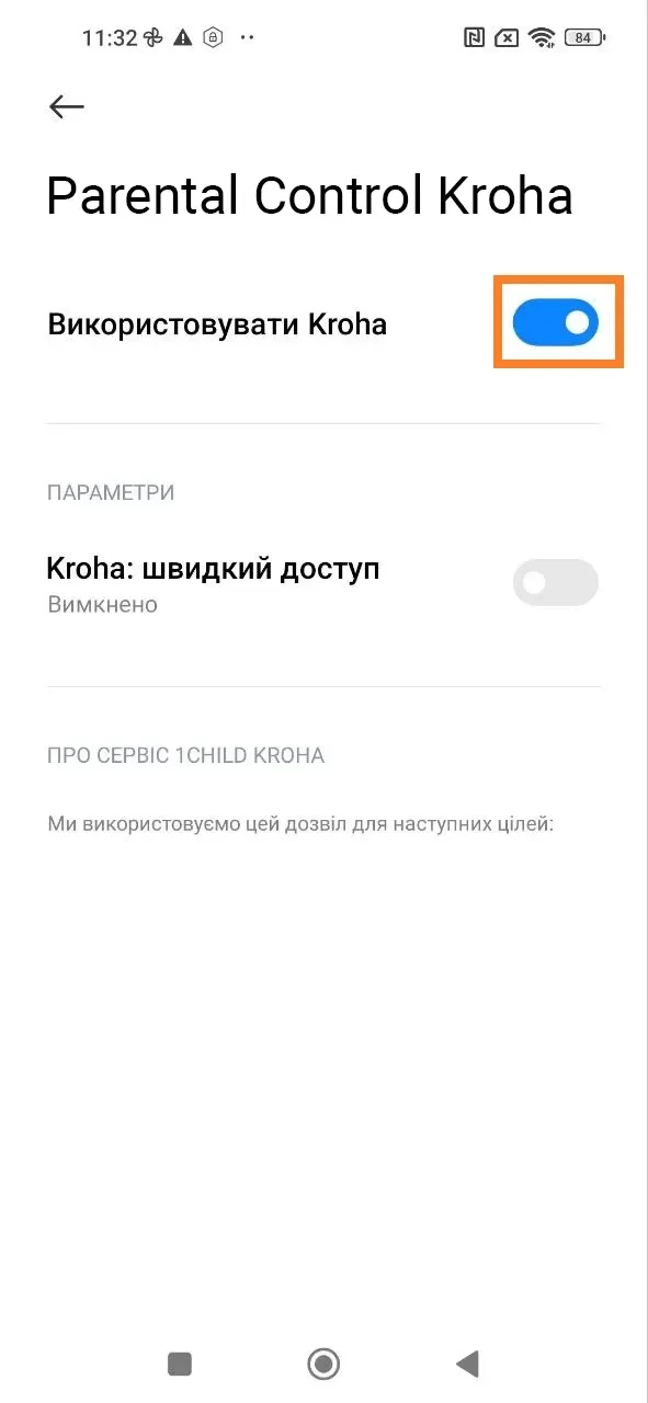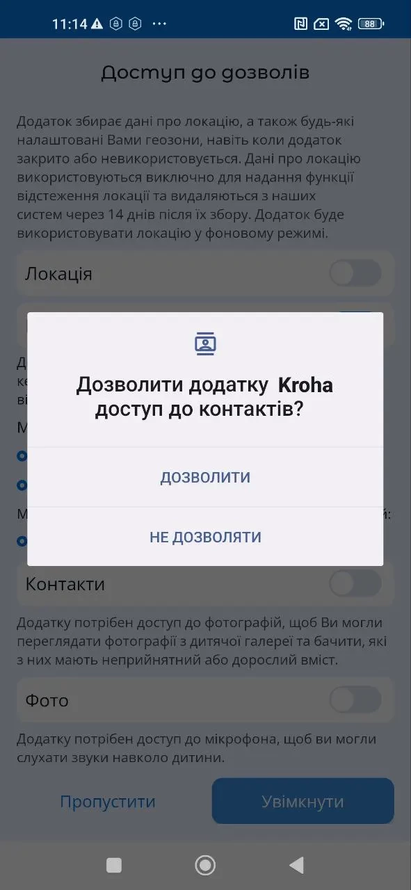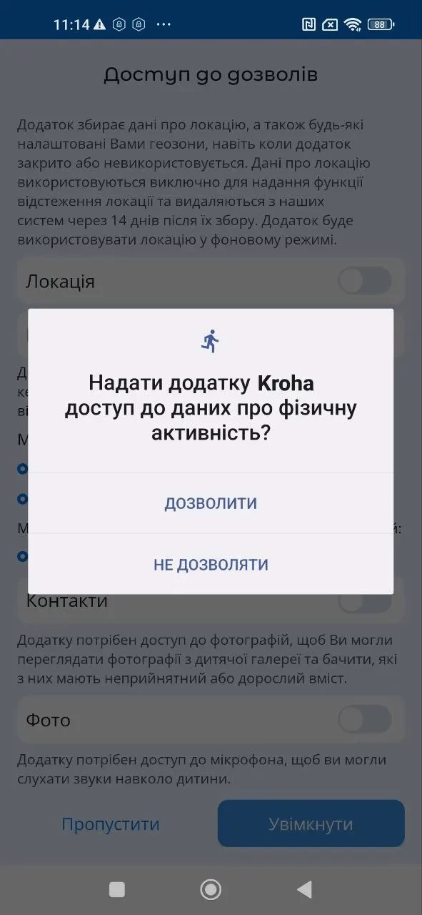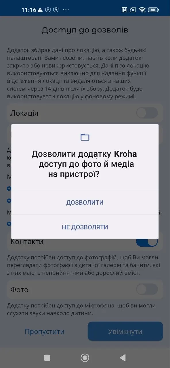 "Використання додатків", активуйте доступ до даних про використання додатків, для правильної роботи застосунку "Батьківський контроль Kroha", для цього прочитайте покрокову інструкцію та натисніть "Увімкнути";