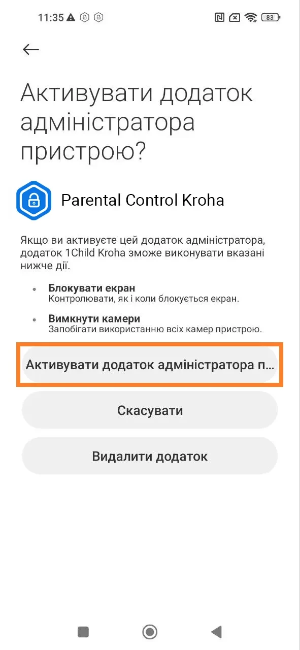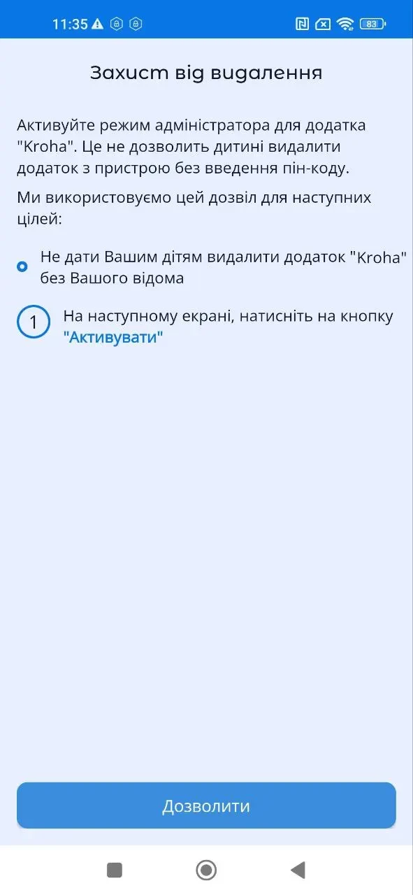 "Захист від видалення", активуйте режим адміністратора для застосунку "Батьківський контроль Kroha". Це не дозволить дитині видалити застосунок з пристрою без введення пін-коду, для цього прочитайте покрокову інструкцію та натисніть "Дозволити";