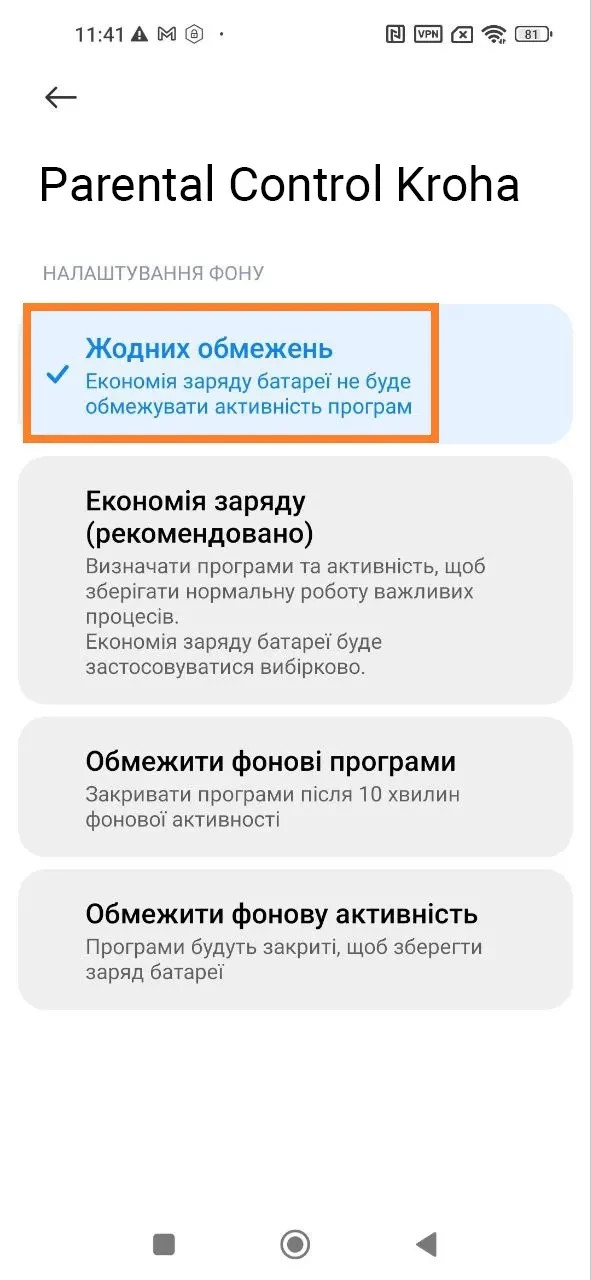 "Оптимізація батареї", для коректної роботи програми необхідно вимкнути оптимізацію батареї для застосунку "Батьківський контроль Kroha", для цього прочитайте покрокову інструкцію та натисніть "далі";