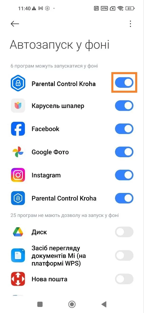 "Автозапуск" та "Контроль фонової активності", активуйте ці функції для того, щоб застосунок "Батьківський контроль Kroha" запускався автоматично при включенні смартфона і щоб застосунок завжди працював у фоновому режимі та контролював пристрій дитини, для цього прочитайте покрокову інструкцію та натисніть "Далі".