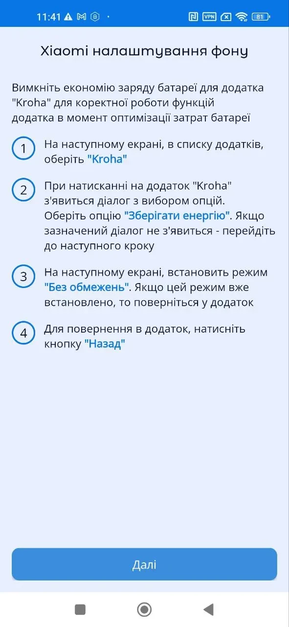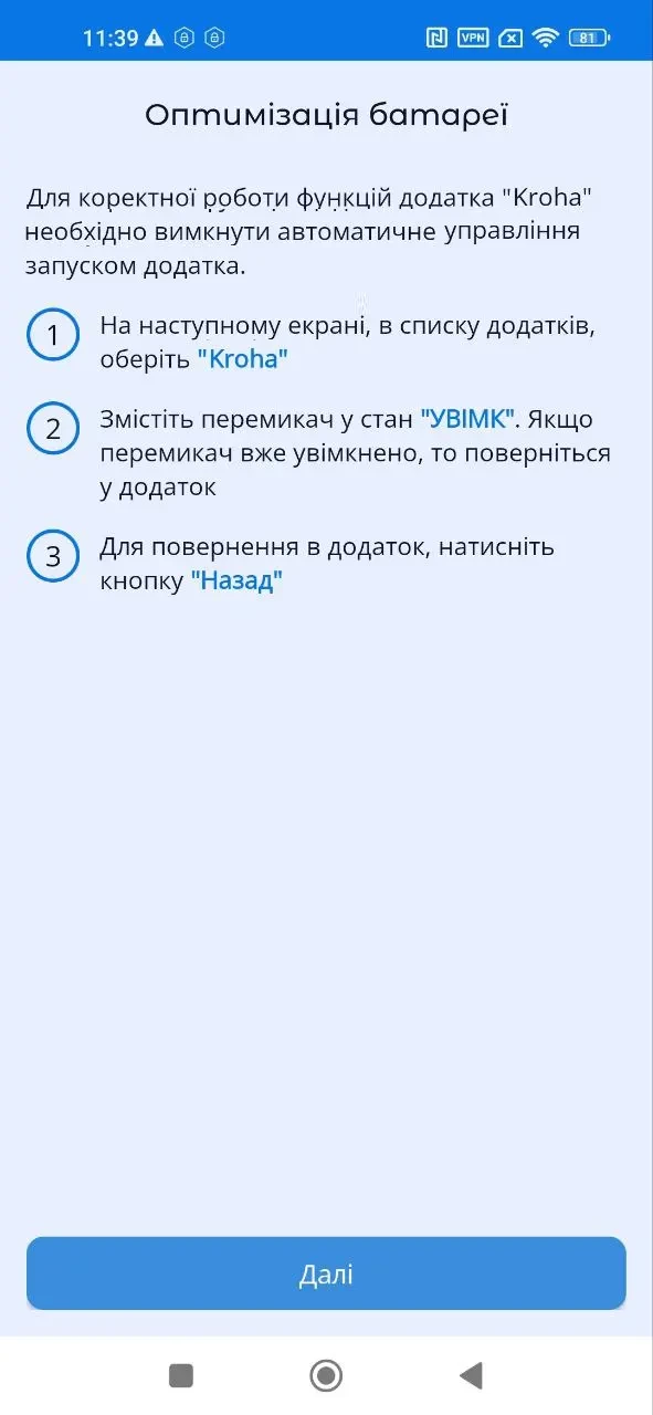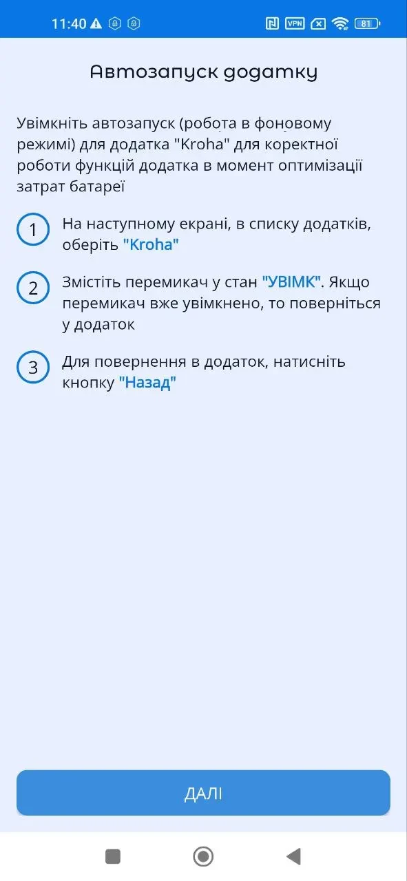 Важливо! Сервіс "Автозапуск", "Контроль фонової активності" та "Оптимізація батареї" працюють не на всіх смартфонах. Тут рекомендується виконати всі етапи, передбачені вказівкою. У випадку, якщо "Автозапуск" буде неактивним, застосунок може бути автоматично зупинений системою Android і не зможе забезпечити роботу функцій застосунку. Алгоритм використання автозапуску залежить від виробника. Після того як Ви натиснете "Далі", зможете побачити на екрані спеціальні налаштування для підключення опції. Ретельно вивчіть усі кроки. Особливу увагу приділіть пункту, де вказано, в якому саме положенні має бути перемикач автозапуску, оскільки цей функціонал відрізняється на різних моделях смартфонів деяких виробників. Зверніть увагу: інколи опції "Автозапуск" та "Робота у фоновому режимі" увімкнені автоматично самим виробником. Якщо функції увімкнені, налаштування змінювати не потрібно.