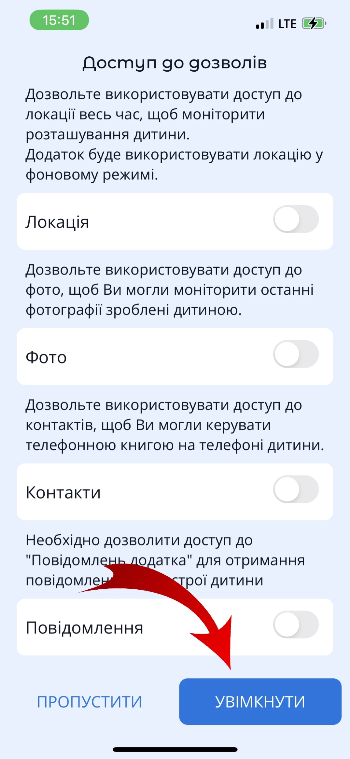 Для коректної роботи застосунку, необхідно налаштувати дозволи при підключенні пристрою дитини до Вашого облікового запису.