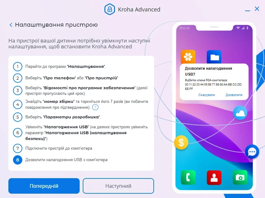 На пристрої дитини не з'являється повідомлення "Дозволити налагодження USB" і кнопка "Наступний" не активна.